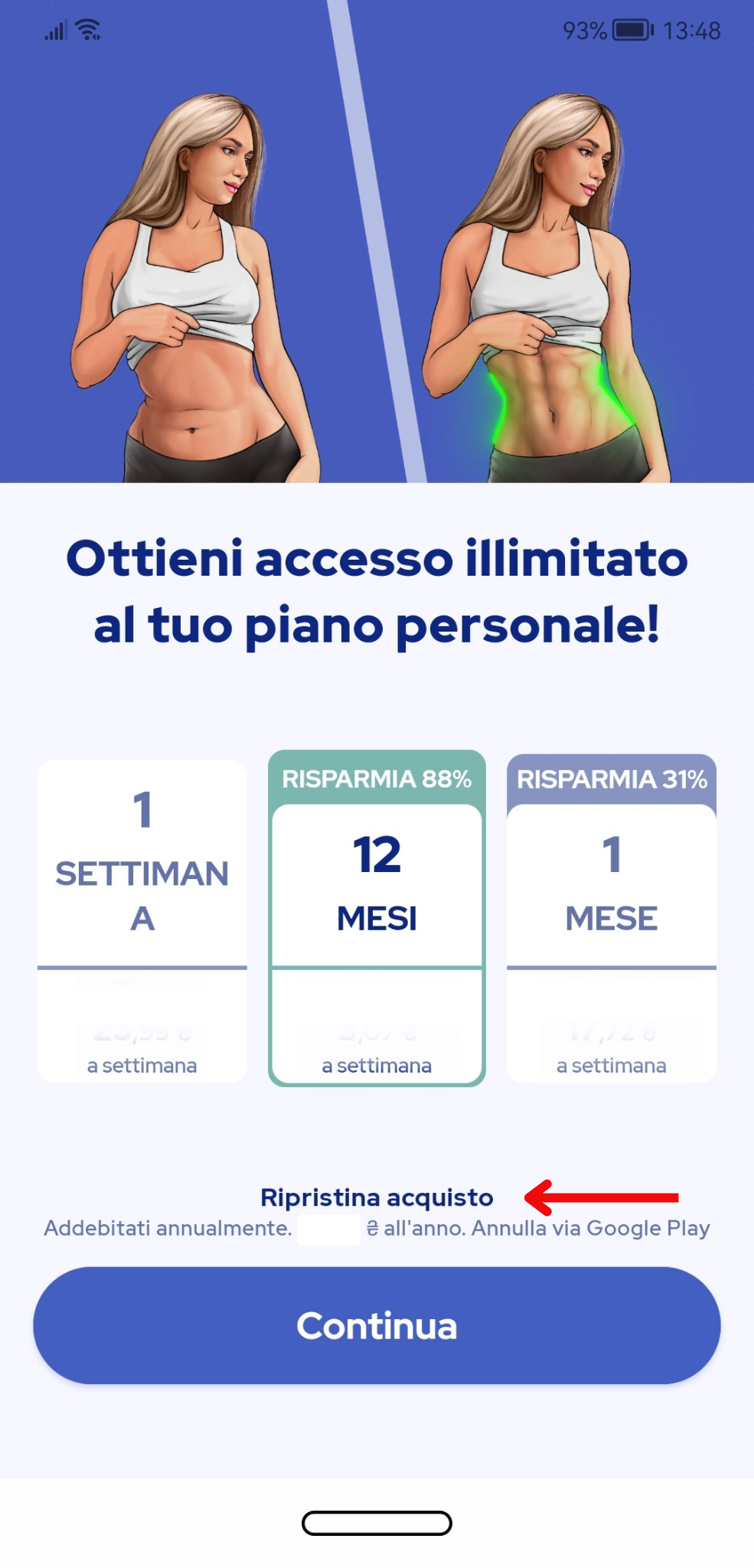 4. Inserisci i tuoi dati personali come se fossi un nuovo utente. Quando arrivi alla schermata del pagamento (quella dove puoi vedere le diverse opzioni di abbonamento), tocca il pulsante “Ripristina acquisto” in fondo allo schermo, come mostrato qui sotto.