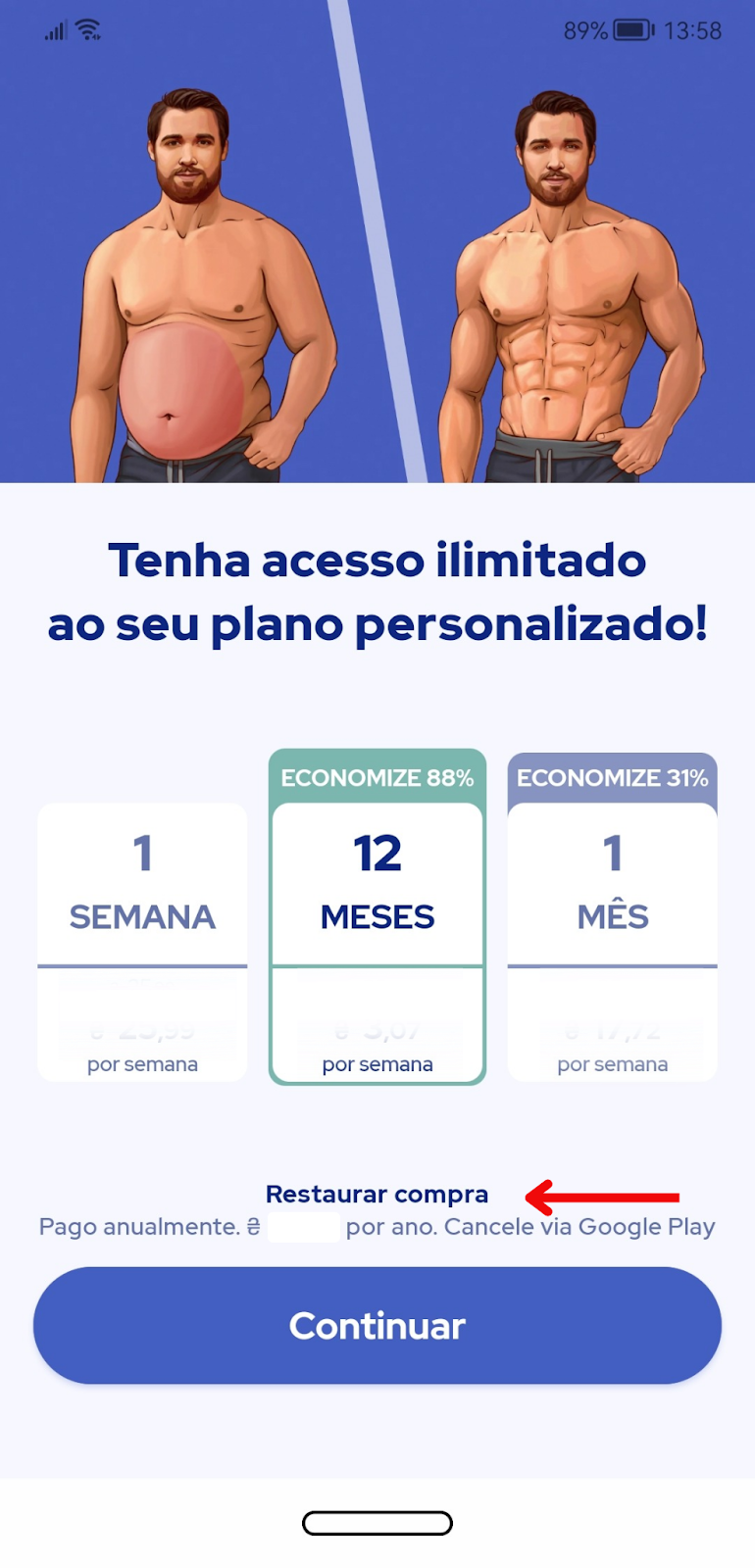Insira os seus dados pessoais como se fosse um novo usuário. Ao chegar na tela de checkout (na qual aparecem diversas opções de assinatura), clique em “Restaurar compra” na parte inferior da tela, conforme a imagem abaixo.